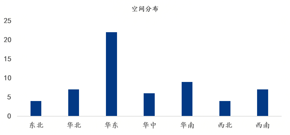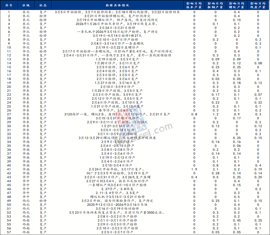 据调研,3月建筑钢材生产企业的检修行为多集中于上中旬,以前期检修计划收尾及进行短期调整为主。从周期维度看,3月短周期检修(10天以下)占比达54.39%,影响产量49.31万吨;中周期检修(10-20天)占比38.60%,影响产量91.4万吨;长周期检修(30天以上)仅占7.02%,影响产量28.1万吨。本轮检修呈现明显的短频化特征,西北地区冬休钢厂也陆续集中复产,生产节奏快速切换至正常轨道。 空间特征:范围覆盖广泛,华东表现集中