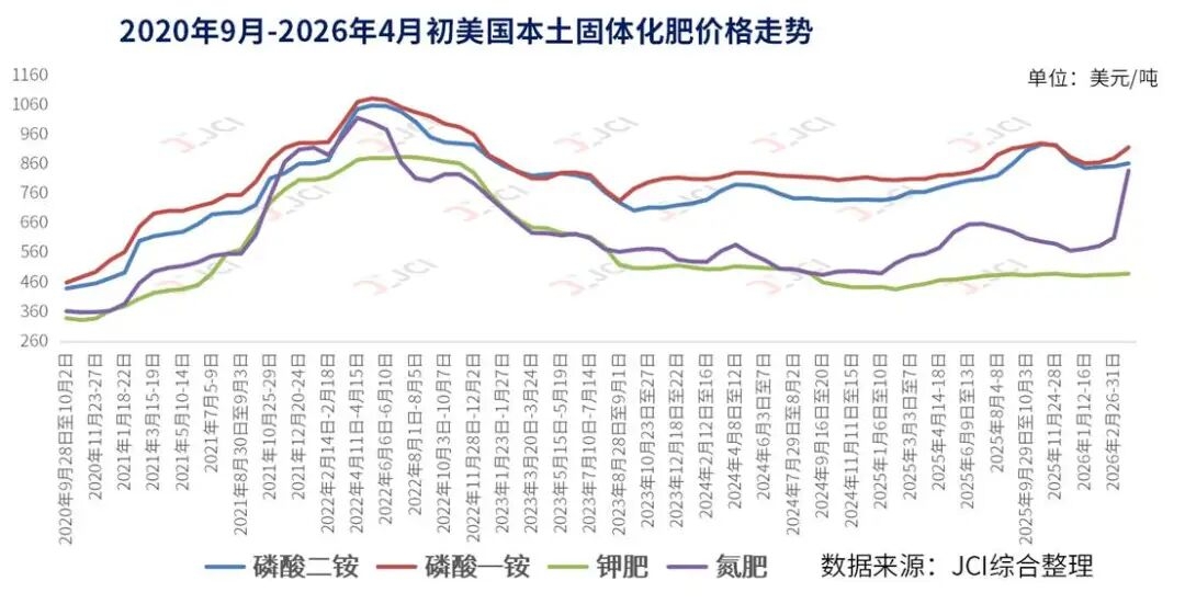 | 2026年以来,受地缘政治动荡与化肥供应链中断双重冲击,美国化肥价格持续飙升,彻底改变了农民的种植决策逻辑。作为需氮量远低于玉米的作物,大豆成为农民规避成本风险的优选,推动美国大豆种植面积意向显著提升,同时播种进度呈现鲜明的区域分化特征。本文结合美国农业部(USDA)最新报告及相关调查数据,全面分析化肥成本攀升背景下美国大豆播种进度、种植面积的当前形势、驱动因素及未来走势,为理解全球大豆市场格局变化提供参考。 化肥成本飙升与地缘政治扰动,直接推动美国大豆种植面积意向实现同比增长。2026年3月2日,区域冲突升级导致霍尔木兹海峡实际关闭,全球35%的海运尿素和20%的液化天然气退出市场,叠加中国、俄罗斯延长化肥出口禁令至2026年底,欧洲能源危机迫使大型氨厂关闭,全球化肥供应陷入紧缺。截至4月中旬,零售尿素价格突破每吨700美元,六周内飙升40%,种植美玉米所需的氮肥成本已超出潜在利润空间,美豆的固氮特性使其成为农民的生存选择。USDA3月31日发布的《种植意向报告》显示,美国大豆种植意向攀升至8470万英亩,较2025年增长4%;而玉米种植意向降至9530万英亩,同比下降3%,其中伊利诺伊州、爱荷华州等传统玉米主产区降幅最为显著,传统玉米连作模式被大豆替代的趋势明显。