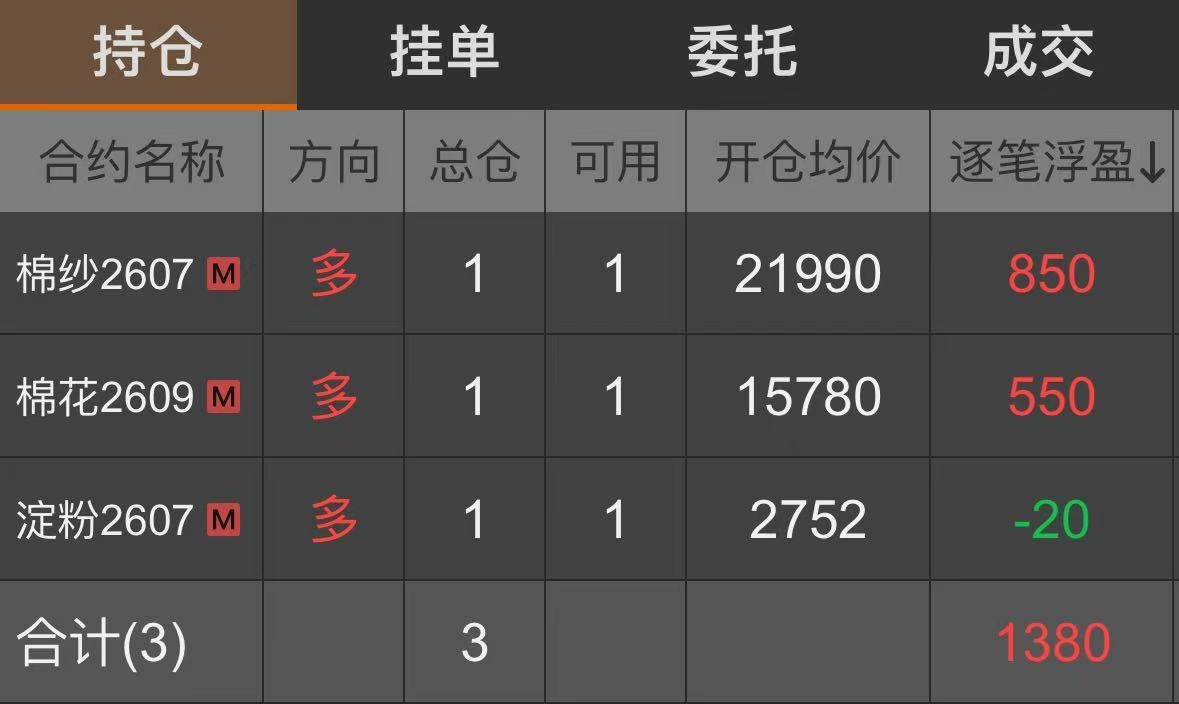 | 一、开仓总结 棉纱:2026年4月8日,达到启动点的开仓条件,所以在14:48开多一手棉纱2605合约,开仓价为21575。棉纱2605合约于2026年4月10日09:51移仓至主力合约2607,开仓价为21990。 淀粉:2026年4月9日,达到启动点的开仓条件,所以在14:44开多一手淀粉2605合约,开仓价为2760。淀粉2605合约于2026年4月15日21:14移仓至主力合约2607,开仓价为2752。