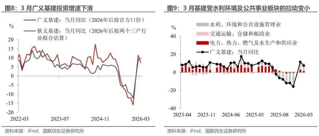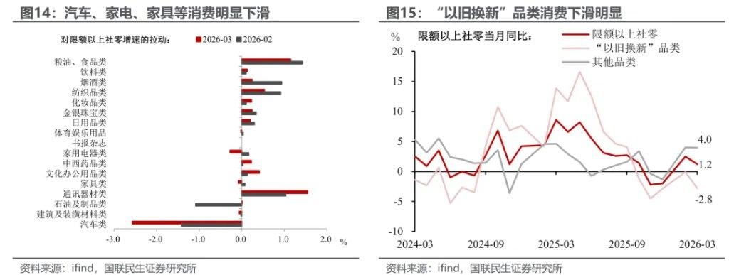 消费:“两新”退坡叠加外围局势影响,商品消费面临“逆风”。3月社零同比增长1.7%(1-2月累计2.8%),商品消费表现依然偏弱。数据下滑固然受到春节季节性扰动消退的影响,但更核心的拖累在于,以旧换新政策力度的边际退坡,叠加外围局势扰动下能源价格走高,对居民实际购买力形成一定挤占。结构上,“两新”相关耐用品增速下滑尤为突出,汽车、家电及家具类消费均录得明显负增长,粮油、纺织等油价相关下游消费也有所回落。