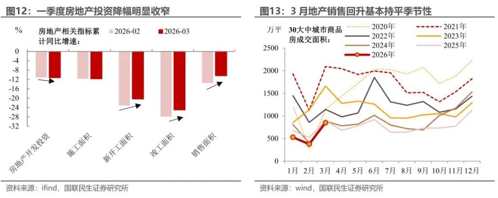 地产:开年投资跌幅明显收窄,地产需求呈现改善迹象。1-3月全国房地产开发投资累计同比-11.2%,较去年底边际收窄,一定程度上受益于年初低基数影响。不过,销售端也呈现出现边际改善信号,3月商品房成交面积回升力度基本持平季节性,并未出现再度走弱。若后续销售回暖能够延续3月表现并形成趋势,有助于为年内地产投资逐步企稳提供支撑。