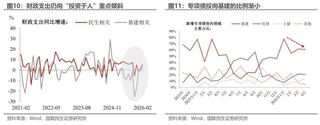 在财政支持下,基建“止跌回稳”难度不大,但上行空间可能依然有限。当前基建增速的韧性,主要源于2025年末以来财政端的持续发力——财政支出加大对基建的支持力度,专项债投向基建的比例也有所上升。但这两方面的支撑均不具备可持续性(近期专项债发行力度已减弱,投向基建的比例也在下滑),因此基建投资有望维持“增”的态势,但“高增”难以持续。
