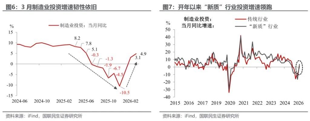 制造业:投资端的“确定性”。3月制造业投资同比增速由3.1%稳步提升至4.9%,在新质生产力相关行业的拉动下展现出较强韧性。与此同时,多数上游行业投资增速的由负转正也同样值得关注。随着出口预期边际改善,叠加去年“对等关税”后形成的低基数效应,制造业投资后续有望延续温和复苏态势,成为投资端最具确定性的支撑力量。