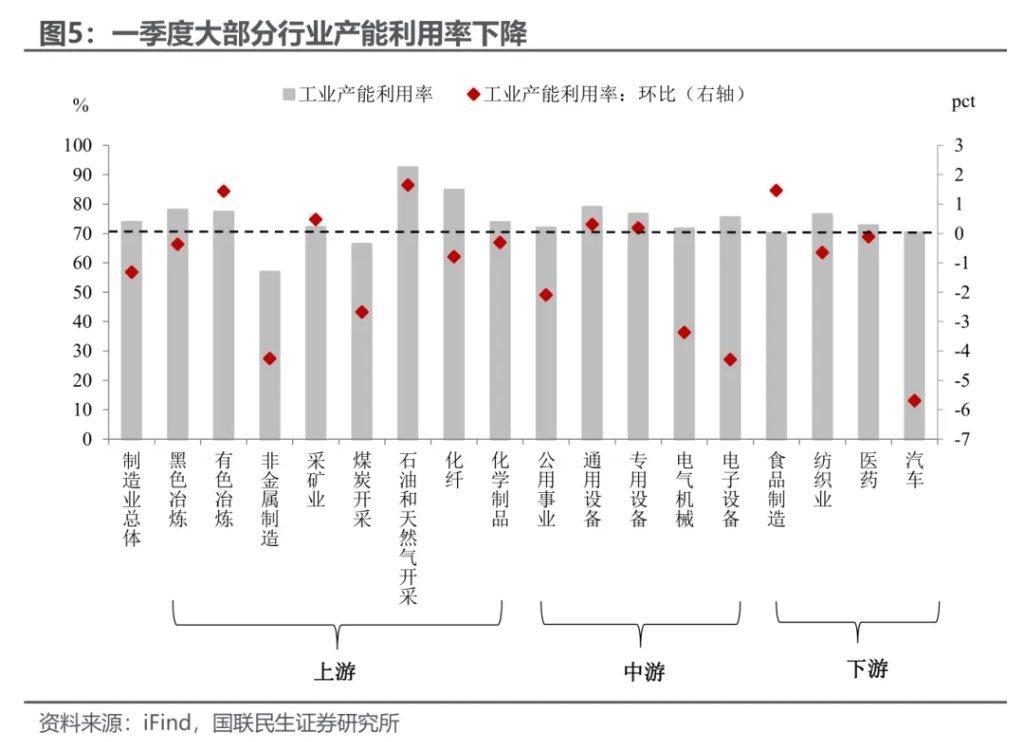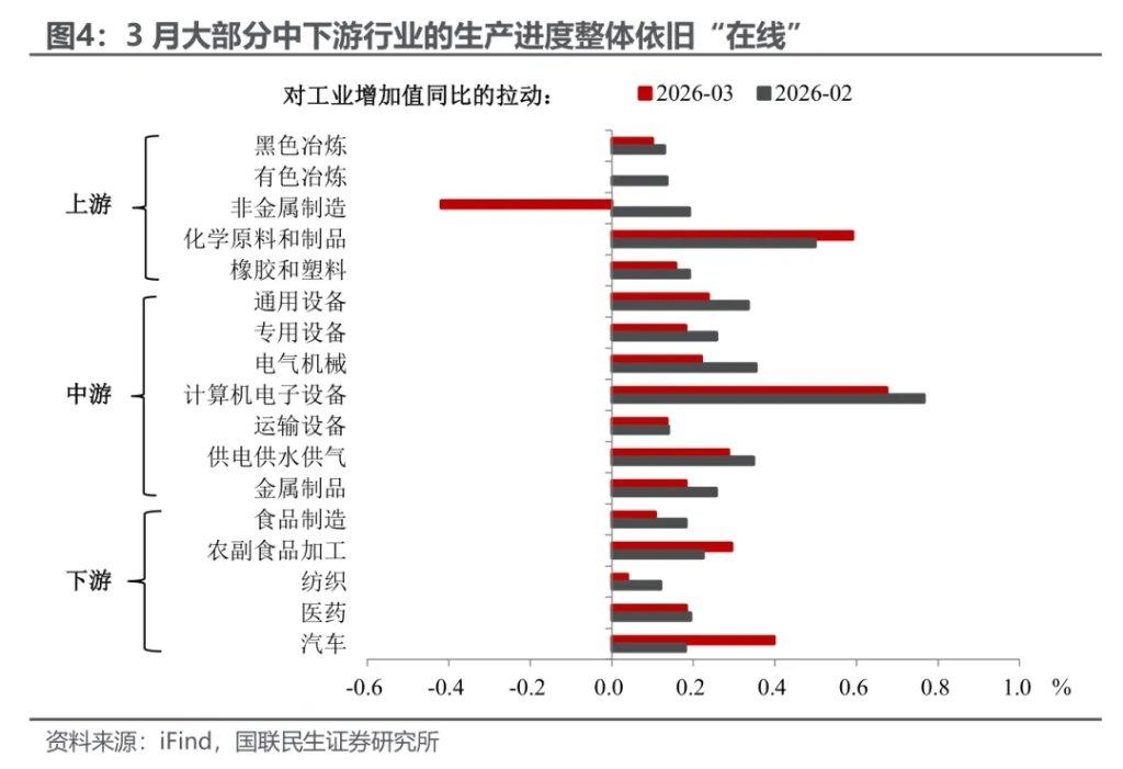 工业:“量”增背后,产能利用率再探底。3月工业增加值同比增速从6.3%小幅回落至5.7%,背后更多反映的是春节错位和低基数效应的自然消退——今年春节偏晚,1-2月因节前赶工推高了同比读数,节后复产周期整体后移,对3月同比数据形成了反向压制。3月大部分中下游行业的生产进度整体依旧“在线”。