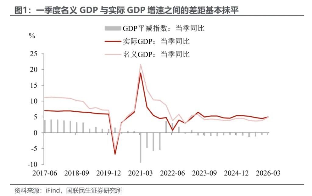 | 一季度GDP增速5%超预期靠什么?出口链、投资链和科技。但比这更重要的是名义GDP更快回升所体现出的“价格总水平”即将转正。这无疑有利于扭转此前低通胀下企业行为和居民预期,只要后续控制住油价上涨的传导,我们认为这一转正在年内对实体经济的影响利大于弊。 同时,美伊冲突以及中东变局下中国产业的一些重塑也在加快演进。我们认为无论是从生产还是投资来看,都将有利于增强中国经济在未来抵御外部冲击的韧性。但对于消费端的一些抑制性因素也需要密切跟踪和关注。 第一,平减指数转正在即,低通胀预期迎来关键拐点。一季度名义GDP增速的回升幅度明显大于实际GDP,此前长达11个季度为负的平减指数有望回正。尽管这一变化背后有国际地缘冲突推升油价的输入性因素,但客观上有利于改善此前的低通胀预期,对企业盈利和居民消费均能产生一定的正向激励。短期来看,再通胀趋势具备可持续性,全年PPI成功转正的难度也并不大。