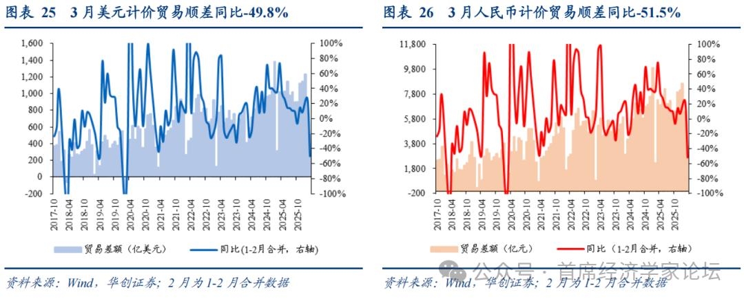 (三)贸易差额:大幅回落 我国贸易顺差同比大幅回落。3月,我国以美元计价贸易顺差511亿美元,同比为-49.8%,1-2月同比为26.3%。2025全年我国美元计价累计贸易顺差额接近1.2万亿美元,累计同比19.6%。