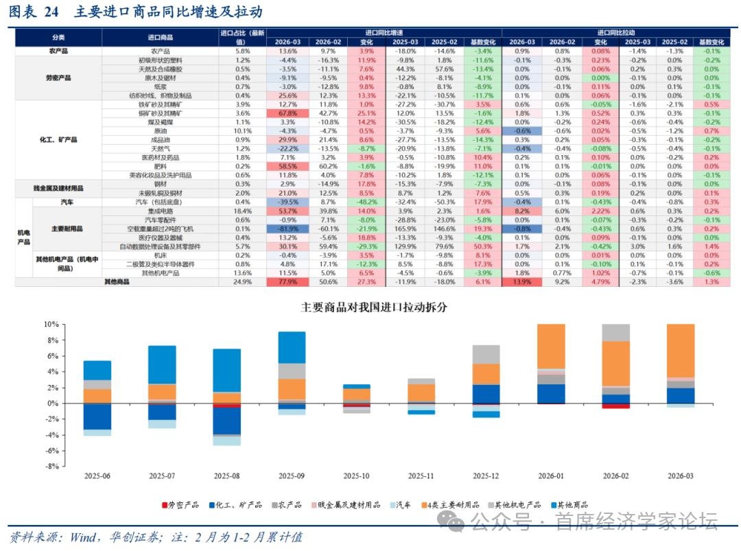 3、进口商品:电子链、化工矿产贡献主要增量 电子链、化工矿产贡献主要增量。电子链主要受益于AI产业链需求依然旺盛,电子链出口需求景气。3月电子链拉动进口增长10%,1-2月拉动8.3%。化工矿产的增长则主要源于中东冲突带来大宗商品涨价,其拉动3月进口增长2.1%,1-2月拉动1.2%。