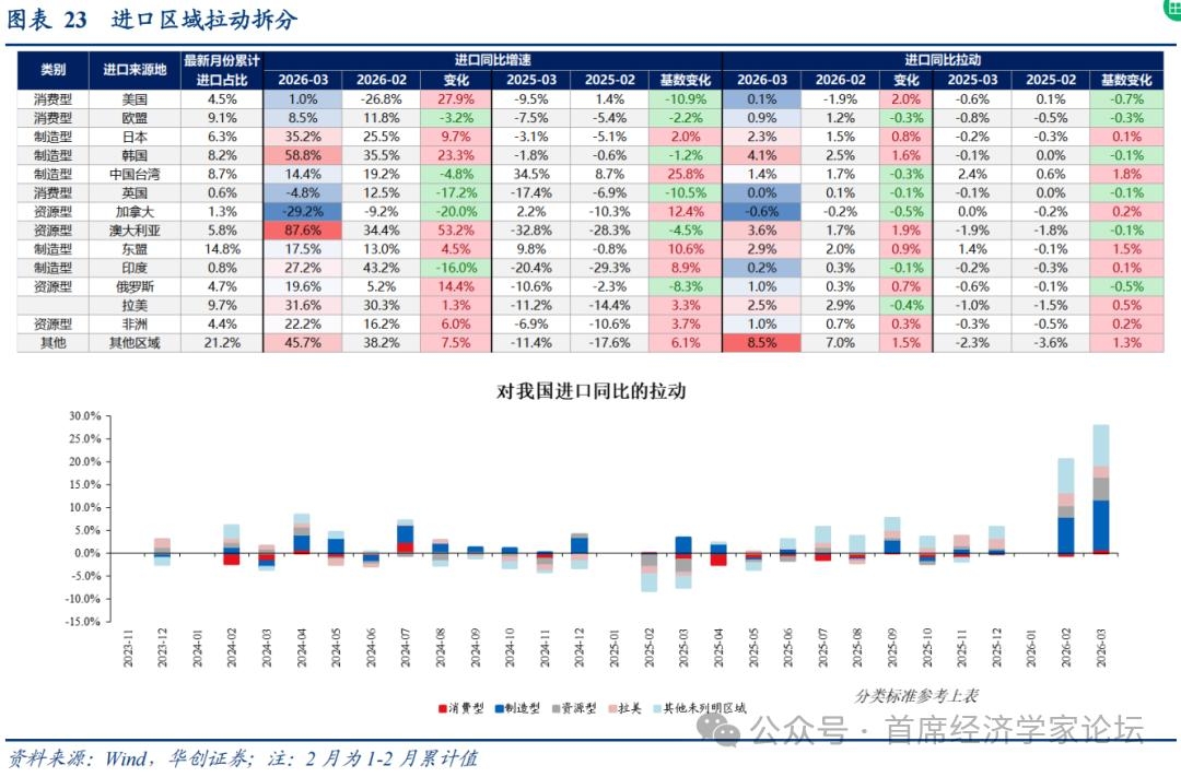 2、进口区域:增长主要源于资源型经济体 受中东冲突导致大宗涨价的影响,资源型经济体进口快速增长。3月,资源型经济体拉动进口增长5%,1-2月拉动2.6%,增长2.4个点。贡献3月整体进口增速改善(8.1个点)的30%左右。
