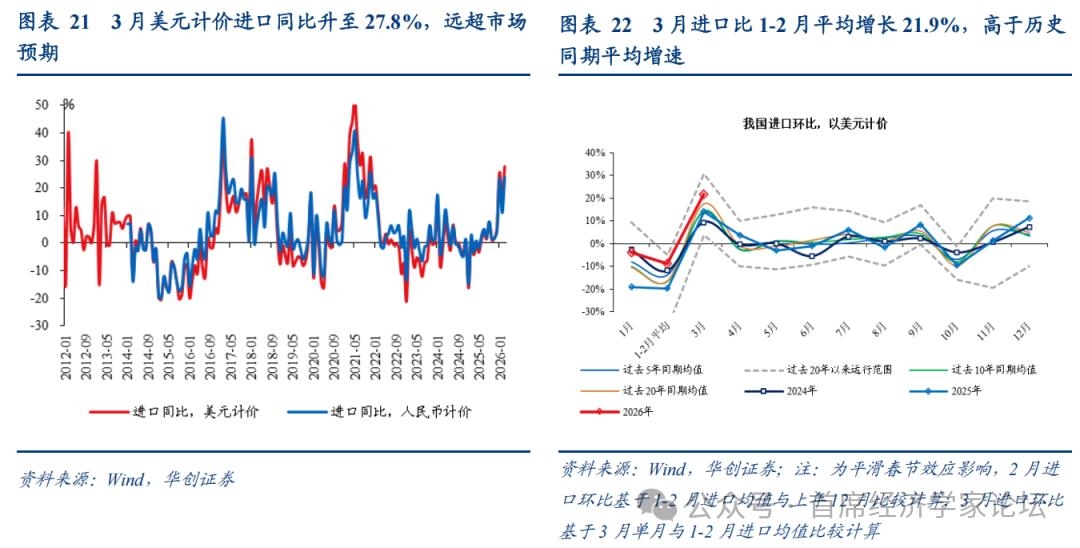 (二)进口 1、进口整体:大幅超预期 进口增速大超市场预期。3月美元计价进口同比27.8%,大幅超出彭博一致预期13.9%,1-2月为19.8%。环比来看,3月进口相比1-2月平均增长21.9%,过去五年同期均值为13.8%;一季度进口环比增长5.3%,与过去20年同期最高值(2011年5.29%)基本持平。