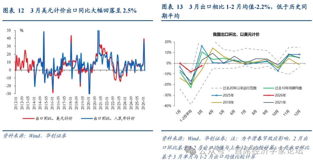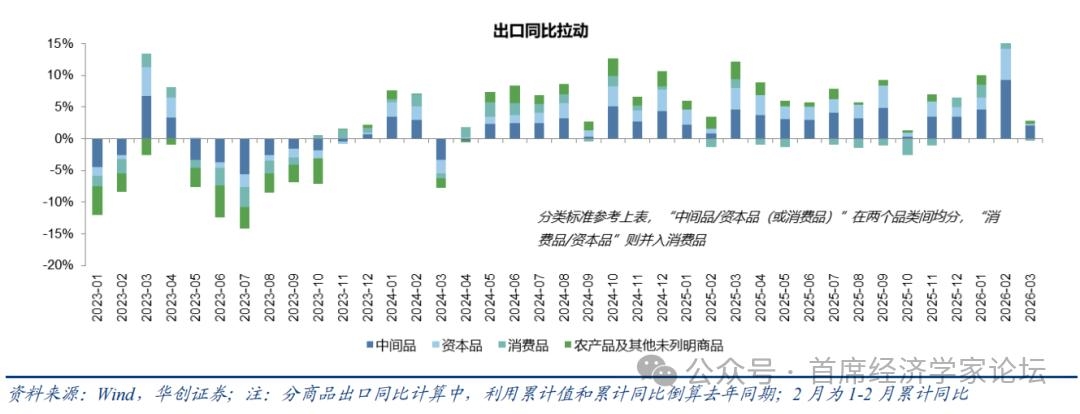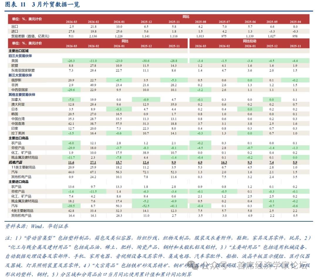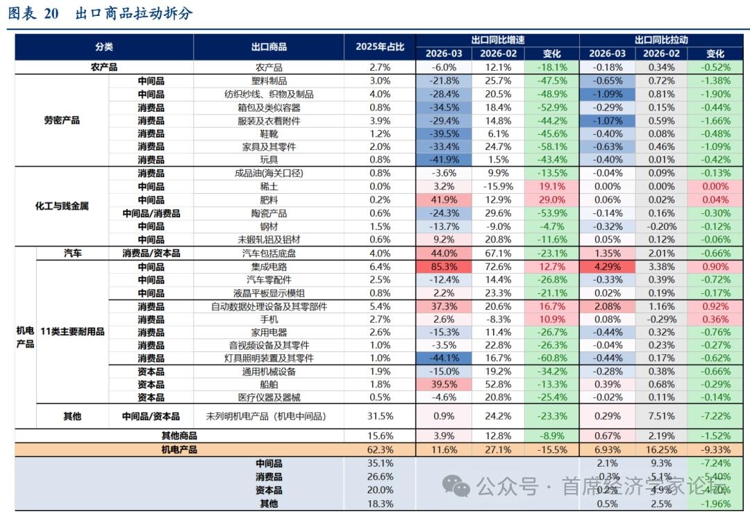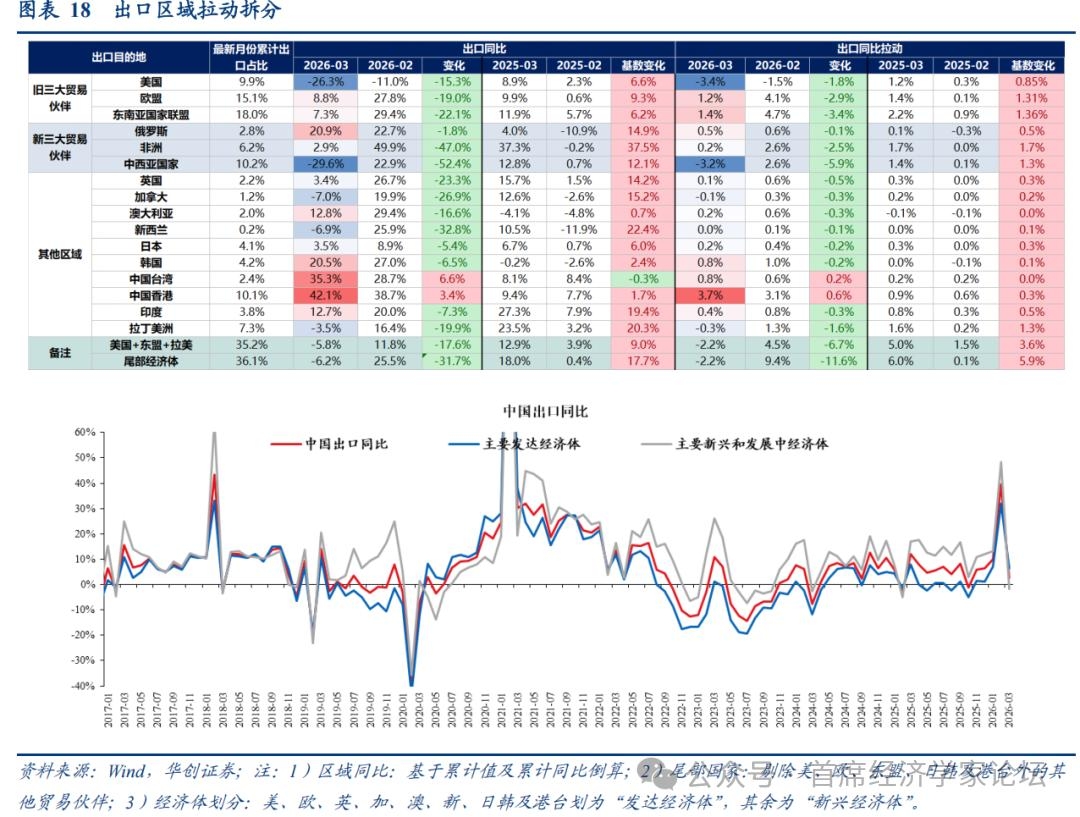 3、出口区域:中西亚和美国是最大拖累 3月,主要发达经济体合计拉动中国出口同比3.3个百分点,较1-2月回落5.7个点;新兴经济体拉动-0.8个百分点,较1-2月大幅回落13.6个点[1]。 其中,发达经济体内部,拉动回落幅度最大的是欧美。3月,欧盟拉动出口1.2%,较1-2月回落2.9个百分点;美国拉动出口-3.4%,较1-2月回落1.8个点。欧美拉动合计较1-2月回落4.7个点,解释了发达经济体拉动回落(5.7个点)的82.5%。 美国需求相关地区出口明显回落,或部分受到去年3月对等关税公布前“抢出口”抬高基数的影响;与此同时,高频指标也显示美国进口需求近期边际走弱。3月,美国、东盟、拉美合计增速-5.8%,1-2月为11.8%;3月拉动为-2.2%,1-2月拉动为4.5%,回落6.7个百分点。高频数据方面,一是美国水运提单进口,4月前8天,同比降至-19.5%,3月为-11.7%;二是全美零售联合会(NRF)对美国进口箱量预估,1-8月增速预计为-3.2%,2025年实际值为-0.4%。 新兴市场中,中西亚是最大拖累,拉动回落幅度由高到低主要包括中西亚、东盟、非洲。中西亚地区中,占中国出口比例比较大的主要是中东地区和中亚国家,我们推断3月出口的大幅下滑与中东冲突有关。3月,出口中西亚地区增速-29.6%(拉动-3.2%),1-2月为22.9%(拉动2.6%)。东盟方面,3月出口增速7.3%,1-2月29.4%,拉动下滑3.4个点至1.4%;非洲方面,3月出口增速2.9%,1-2月为49.9%,拉动下滑2.5个点至0.2%。
