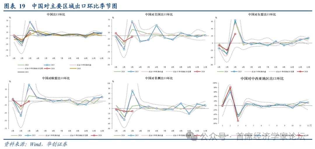 环比来看,3月主要区域出口环比普遍转弱,这在一定程度上反映了1-2月春节效应下出口脉冲集中释放后的自然回落。其中,东盟、欧盟和非洲是典型例子,相关地区1-2月出口环比已接近历史同期峰值,3月则明显低于历史同期均值,但仍好于历史最弱水平。相较之下,中西亚和美国的出口环比动能偏弱则更为突出,中西亚3月出口环比降至过去十年同期最低,美国则基本持平于过去十年同期最低值。