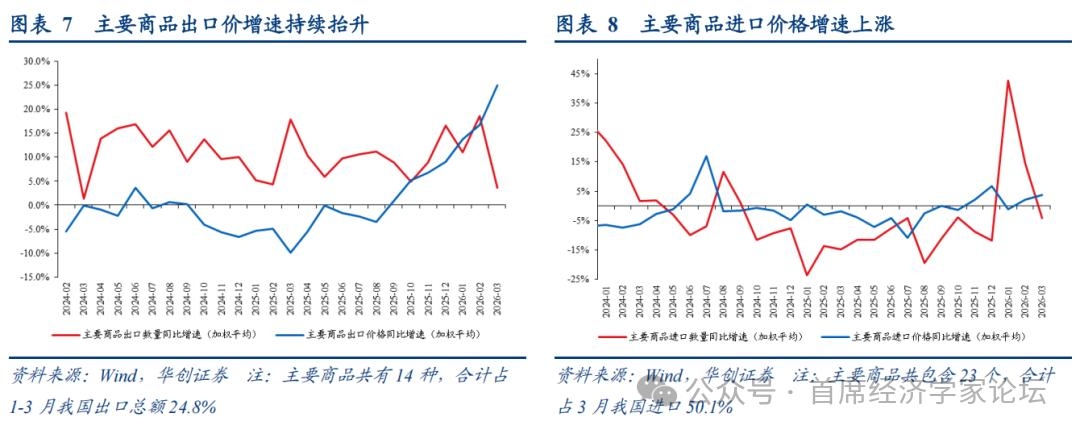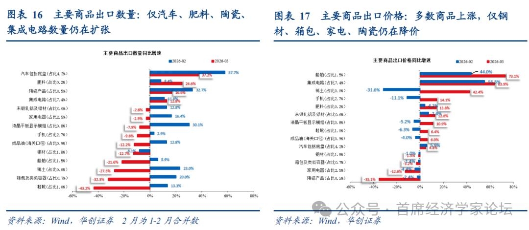 (二)量价分化:进出口或均价升量落 主要商品进出口由“量强价弱”转向“量弱价强”。 出口方面,统计快讯报告的14种主要商品(占1-3月我国出口总额24.8%),3月出口价格加权平均同比增速升至25%,1-2月为16.8%;出口数量同比增速为3.6%,1-2月为16.8%。 进口方面,统计快讯报告的23种主要商品(占3月我国进口总额50.1%),3月进口价格加权平均增速为3.7%,1-2月为2.1%;进口数量同比增速为-4.2%,1-2月为14.6%。