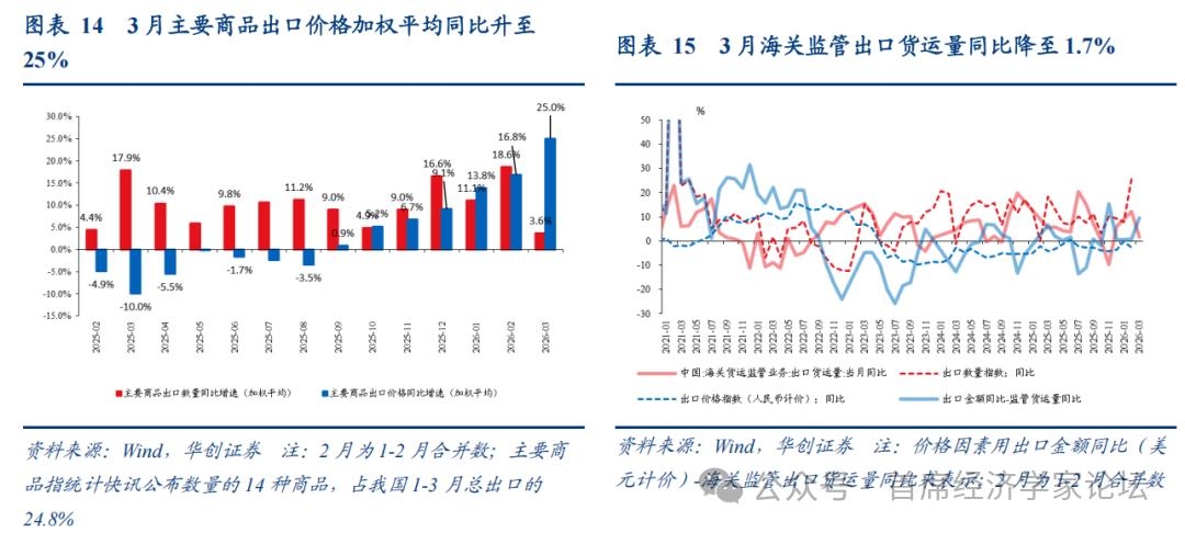 2、出口量价:量的因素或显著回落,价格因素改善 14种主要商品量、价增速统计显示,数量增速显著回落,价格增速进一步改善。14种主要商品出口单价加权平均增速1-2月为16.8%,3月为25%;数量增速1-2月为18.6%,3月为3.6%。 海关监管出口货运量统计亦显示,3月出口量大幅回落,同比为1.7%,低于整体出口金额增速2.5%,1-2月为12.3%。 回顾1-2月,出口价格(人民币)降幅收窄,1-2月平均为-2.55%,前值为-3.6%;出口数量指数平均同比25.7%,前值为9.2%。