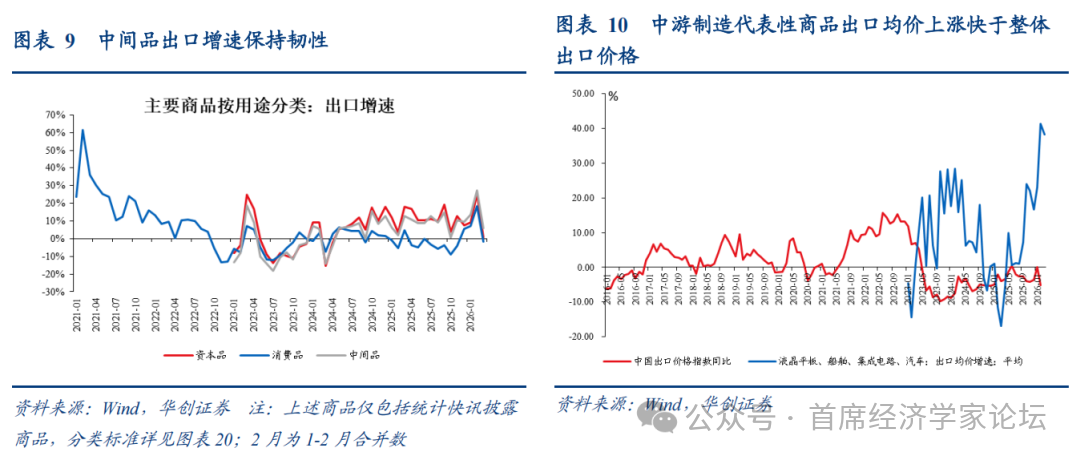 (三)品类分化:“中游”顺价能力或更强 一是,3月机电产品出口仍然高增。3月机电产品出口增长11.2%(1-2月为27.1%),远高于整体出口2.5%的增速,拉动整体出口增长6.9个点。 二是,统计快讯披露的20多种主要商品中,中间品出口增速仍保持韧性。3月,统计快讯披露的20多种主要商品中,中间品出口同比5.8%(1-2月为27.3%),资本品0.7%(1-2月为25.3%),消费品仅有-1.5%(1-2月为18.6%)。 三是,统计快讯披露的主要商品中,中游制造的代表性商品,即,汽车、船舶、集成电路、液晶平板显示模组等四类商品,出口均价平均增速大幅上行,远高于中国整体出口价格指数同比增速。3月,中游四类代表性商品出口均价平均增速为38.2%,2月为41.3%,1月为23%,中国出口价格指数同比增速1、2月分别为0.01%、-5.1%。