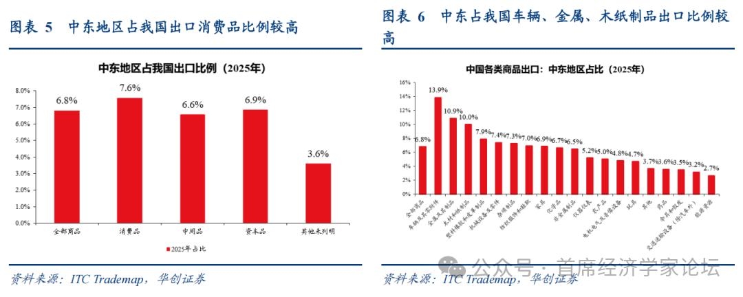 往后看,我国对中东地区主要出口消费品(车、金属制品、木纸制品),该地区需求回落的后续影响可能主要体现在此,有待进一步跟踪观察。 从规模来看,中东地区占我国出口消费品比例相对较高(图5)。2025年,中东占我国总出口比例约6.8%,占消费品、中间品、资本品三大类商品比例则分别为7.6%、6.6%、6.9%。从商品类别看,中东市场影响较大的主要是汽车、金属制品、木纸制品,分别占我国出口这三类商品的13.9%、10.9%、10%。 从拉动来看,去年中东地区主要增量贡献在资本品(机械设备及零件)以及车辆及零附件。2025年,中东地区拉动我国出口增长0.6个点;拉动资本品、消费品和中间品分别增长1%、0.6%、0.4%。按商品大类看,中东地区主要拉动在车辆及零附件,为2.8%,其次是机械设备及零件,拉动0.9%的增长。
