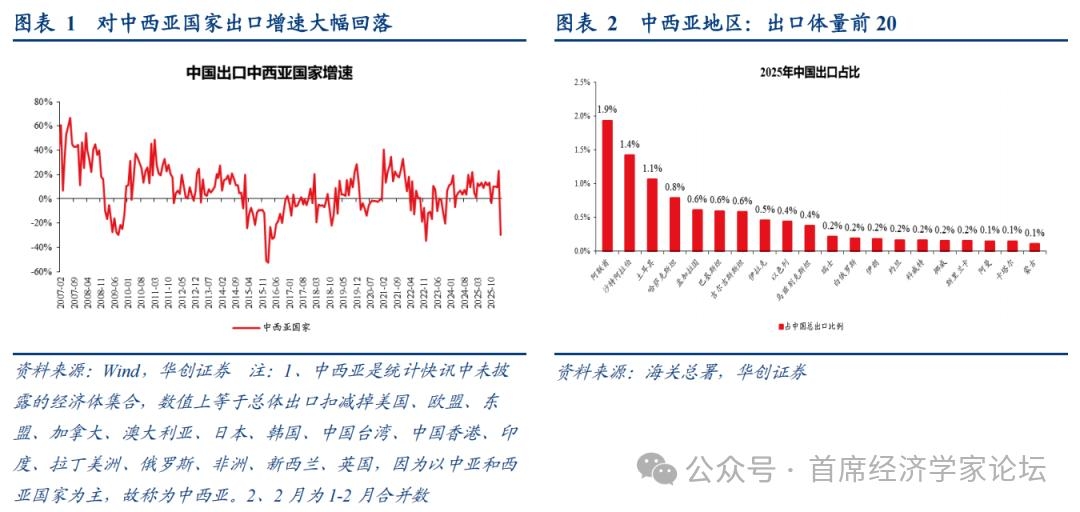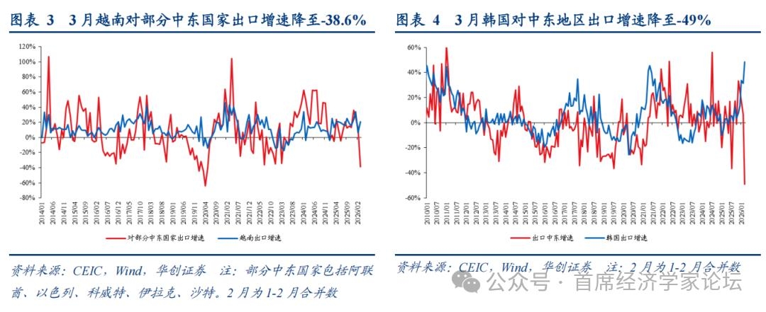| 一、中东冲突扰动下贸易量价分化的三点观察 (一)区域分化:中东地区出口或显著回落 中西亚地区出口大幅回落。3月,中国对中西亚地区出口增速降至-29.6%,相比1-2月累计同比22.9%大幅回落52.4个点,对中国整体出口拉动下滑5.9个百分点。 中国对该地区出口中,中东经济体占比较大。中西亚国家是统计快讯中未披露的经济体集合,数值上等于总体出口扣减掉美国、欧盟、东盟、加拿大、澳大利亚、日本、韩国、中国台湾、中国香港、印度、拉丁美洲、俄罗斯、非洲、新西兰、英国,因为以中亚和西亚国家为主,故称为中西亚。其中,中国出口体量较大的经济体主要包括阿联酋、沙特、土耳其、哈萨克斯坦等(图2)。 因此,中西亚出口的大幅回落,或反映中东拖累较大。 此外,一个侧面证据是,3月中东地区分别拖累韩、越出口增长1.5%、0.7%(仅部分中东国家)。3月,越南对五个中东国家(阿联酋、以色列、科威特、伊拉克、沙特)出口增速降至-38.6%,拖累越南出口增长0.7个点,较1-2月拉动回落1个点。同期,韩国对中东地区出口增速大幅降至-49%,拖累韩国出口增长1.5个点,较1-2月拉动边际回落1.7个百分点。