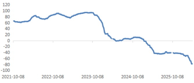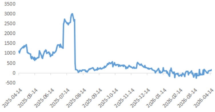图为中国电解铜社会库存(单位:万吨) 截至4月16日,全球铜库存总量为127万吨,较前一周下降1.5万吨,主要去库力量仍来自中国。 值得关注的是,COMEX与LME铜价差已扩大至100美元/吨以上,COMEX铜货源向LME市场流动的动力减弱。LME 0—3合约价差从年度最高113美元/吨收窄至26美元/吨,国内铜进口窗口因此趋于关闭,进口铜对国内供应的补充力度下降。叠加国内炼厂二季度减产预期,国内社会库存仍有望延续去化态势,全球高库存压力将进一步缓解。
