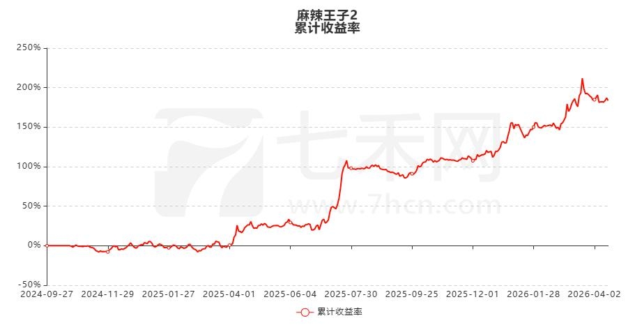 账户“麻辣王子2”,于2024年9月27日在七禾网资管排行榜上注册,2025年10月28日才开始交易。账户前期表现欠佳,进入2024年中旬后一改颓势,收益率逐步增长,资金曲线整体呈震荡上升态势。截至目前,账户累计净值2.8362,累计收益率183.62%,累计净利润330.58万,最大回撤12.66% 。
