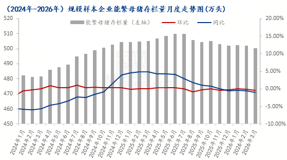 4月份国内生猪价格继续低位下行,市场由月初的9.4元/公斤降至14日的8.7元/公斤,区间跌幅达7.4%,局部地区猪价已跌破“8”元防线。市场自繁自养头均亏损接近400元,行业全线深亏格局未改。前期能繁母猪存栏基数偏高带来的产能释放,2026年生猪市场供应压力仍然较大。从10个月养殖周期传导推算,上半年处于高产能的兑现期,市场供给整体充裕;其次,猪肉消费逐步进入传统淡季,终端白条走货缓慢。清明假期对整体需求的拉动作用有限,“供强需弱”的基本面未改,需求承接力度不足难以扭转整体疲软格局。 2、能繁母猪存栏缓降调整