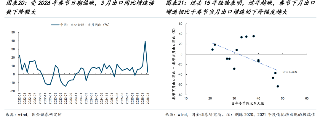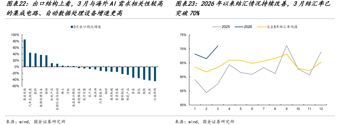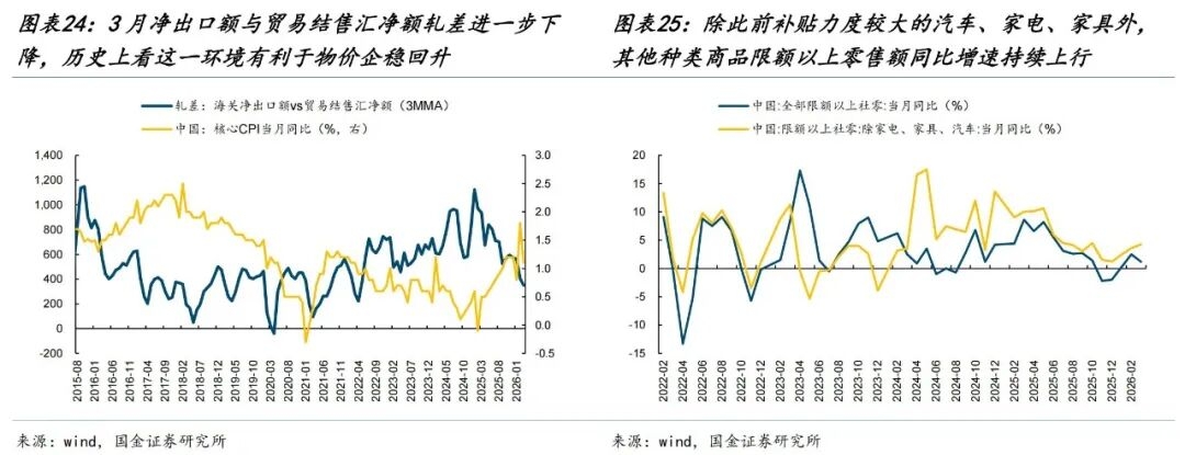 3、结汇持续改善,由外向内的景气扩散值得期待 3月国内出口同比增长2.5%,读数上相较于2月的39.6%有较大幅度的回落,不过主要是受今年春节偏晚的季节性影响所致。参考过去15年的经验来看:过年时间越晚,春节后下个月出口增速相比于春节当月出口增速的下降幅度普遍会越大;此外,过去15年中,春节后一个月出口额相比于春节当月出口额环比增速的中位数为4.5%,而今年3月出口额相比于2月环比增长了7.1%,略强于季节性特征。从结构特征的角度来看,3月与海外AI需求相关性较高的集成电路、自动数据处理设备类商品的出口增速更高。 与此同时,国内结汇情况持续改善:从商业银行涉外收付款的视角来看,2026年以来结汇额占外币收款额的比重在2025年的基础上持续走高,3月的结汇率突破70%。与此同时,3月净出口额与经常账户下贸易部门净结汇额的轧差进一步缩小,历史经验来看这一轧差的缩小往往对应着核心CPI企稳回升时期。当前国内消费动能的修复进程仍在持续,非补贴类商品销售情况表现较好。限额以上社零除家电、家具、汽车三项补贴项目外,其他项目同比增速上升至4.2%,内生修复动能仍在。较强的出口与资金的回流可能会在未来给内需带来新的驱动,由外向内的景气扩散值得期待。