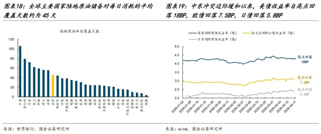 第二种路径下,市场可能会面临更大的供应链冲击压力。从原油储备情况来看,全球主要国家陆上原油储备量平均可以覆盖45天的原油消耗量。中东地缘政治风险冲击之下,3月全球物价水平并未出现剧烈上升、全球供应链相对平稳的背后,可能是各国逐步释放原油储备。当前霍尔木兹海峡并未完全开放,在主要国家原油库存已经消耗一波的情况下,如果美伊冲突出现二次升级,将会对全球供应链产生更为明显的冲击。在此前的报告《市场当前并非稳态》中我们曾指出,在这一路径下当前呈现出一定韧性的科技类资产也难以独善其身,而传统能源链资产很可能是市场波动中的核心避风港。 此外,从最近两周债券市场的表现来看,虽然地缘风险出现缓和,但能源进口依赖度较高的国家长端国债收益率下行幅度相对较小:美国的对外能源依赖度相对较低,10Y国债收益率已从高点下降18.0BP;而对外能源依赖度相对较高的欧元区和日本,其10Y收益率分别只下降了7.5BP和5.8BP。对于能源独立性较差的国家来说,如果通胀预期开始上升后,长端利率可能会走高,进一步抑制需求。