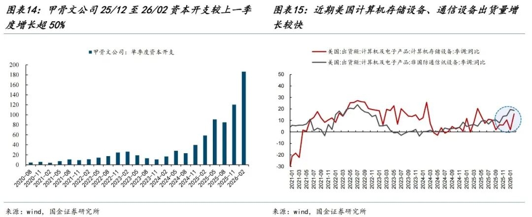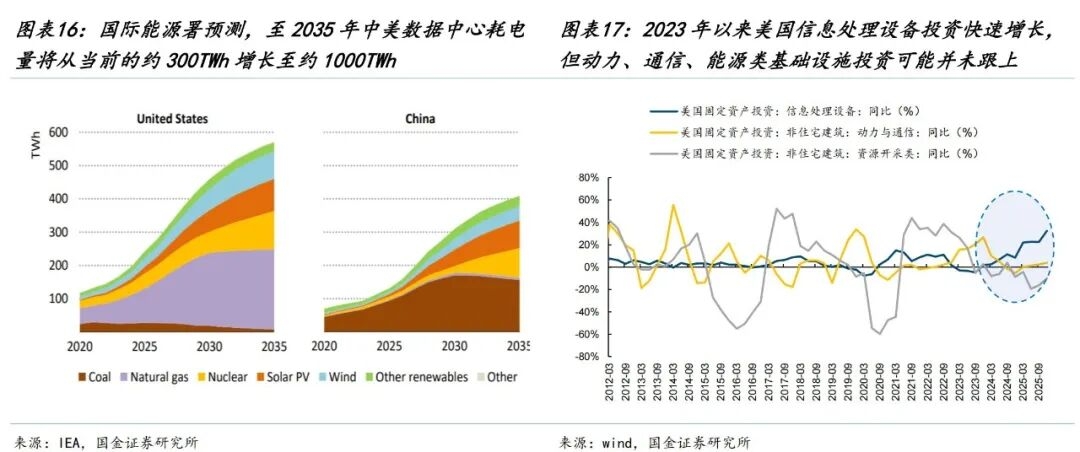 在第一种路径下,全球经济的运行模式相较于中东冲突发生以前并不会出现太大的变化。在供应链冲击逐步平复之后,由AI驱动的科技领域景气得以维持,科技领域投资的增长也会带动能源相关实物资产需求的增长,新一轮HALO交易可能将会出现。2026年一季度,海外AI领域的资本开支强度很可能仍在提升:从甲骨文公司公布的2026年第三财季季报(对应2025年12月至2026年2月期间)来看,在数据中心建设的推动下资本开支单季度增长60亿美元,相比上一财季的增长幅度超过50%;此外,最近两个月美国计算机存储设备、非国防用通信设备的出货量的同比增速均有较快增长。而AI数据中心建设的加速将会带来能源需求的快速增长,国际能源署预计中、美两国数据中心的年耗电量将从当前的300TWh左右上升至2035年约1000TWh左右的水平,对传统能源及新能源的需求均有显著拉动。自2023年AI进入快速发展阶段以来,美国在信息处理设备领域的投资增速快速增长,但是在能源开采、动力及通信基础设施建设领域的投资却明显没有跟上。以能源为代表的实物资产领域可能是未来景气扩散的方向。