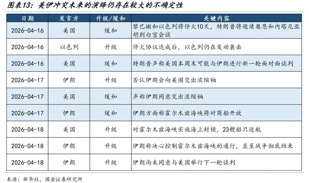 2、地缘风险不同演绎路径下,能源或是共同受益方向 当前中东地缘政治冲突的发展方向仍存在高度不确定性,过去一周内美国与伊朗方面在霍尔木兹海峡控制权、伊朗浓缩铀活动是否持续进行、是否开启下一轮谈判等多个关键问题上的表述存在较大差异。未来的演绎有着两种截然不同的路径:一是随着美伊谈判推进,地缘政治风险逐步排除;二是美伊双方在核心利益诉求上始终难以达成一致,中东冲突将出现二次升级,尾部风险再度加剧。由于美伊双方在关键问题上的分歧始终存在,且双方的表态均较为强硬,这两种演绎路径均是有可能出现的情境。