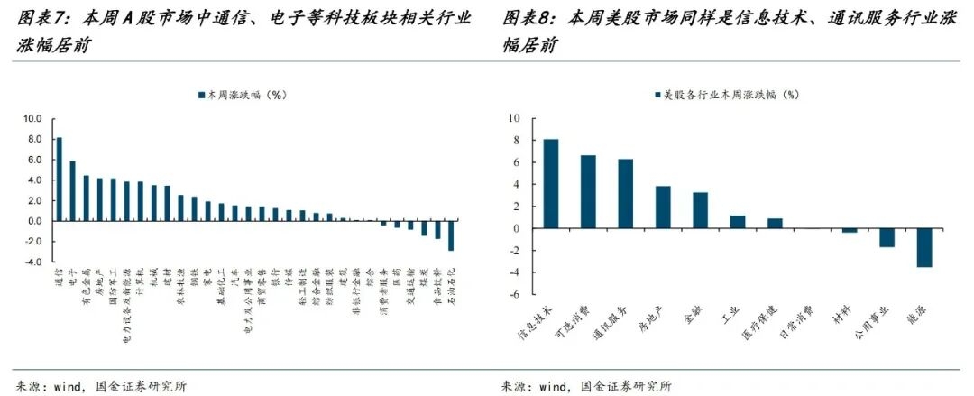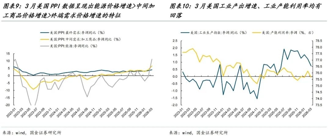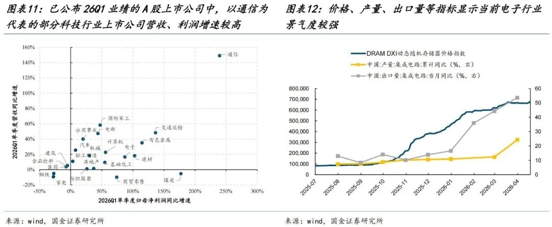 从行业特征上来看,过去一周A股中通信、电子为代表的科技板块相关行业领涨市场,美股中同样也是信息技术板块涨幅居前。这一市场特征的背后,反映出的是投资者在市场尾部风险显著缓解之后,阶段性更加青睐相对确定性更强的科技板块资产。 中东地缘政治风险虽有所缓和,但是其对未来全球经济运行整体情况的影响并不明朗。尽管3月美国PPI同比增速相对温和且不及预期,但呈现出能源商品价格增速>中间加工商品价格增速>终端需求价格增速,物价压力的传导可能正在进行中。此外,3月美国工业产出同比增速出现下滑,工业产能利用率也有明显回落,市场对地缘政治冲突加剧供应链脆弱性的担忧并未完全消除。 相对来说,当前科技领域有着更强的景气确定性:在已公布2026年一季报的A股上市公司中,以通信为代表的部分科技行业上市公司营收、利润增速较高;与此同时,受益于海外AI需求的带动,当前电子行业的景气度也相对较强:存储器价格指数持续上行,国内集成电路产量与出口量增长速度较快。