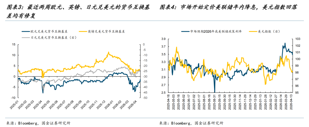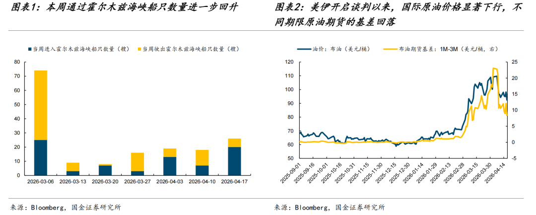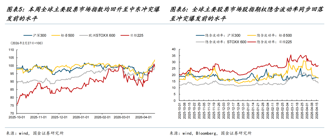 | 1、尾部风险缓解,市场转向风险偏好回升+确定性溢价 尽管美国与伊朗双方在巴基斯坦伊斯兰堡的会谈并没有达成协议,但随着美伊双方开启阶段性停火、以色列与黎巴嫩在美国达成临时停火协议、伊朗方面声称霍尔木兹海峡对商船开放,投资者对于中东冲突再次出现急剧恶化的担忧逐步减弱,尾部风险缓解。 地缘政治风险阶段性缓和,一方面降低了原油价格进一步飙升的可能性:本周在霍尔木兹海峡通行的船只数量出现回升,且在周五伊朗方面声称允许商船通过霍尔木兹海峡后,国际原油价格大幅回落,不同期限的基差也有收敛。另一方面也缓解了对美元流动性的恐慌式追逐,全球金融市场出现流动性危机的可能性大幅降低:最近两周内欧元、英镑、日元兑美元的货币互换基差均有修复,市场对美联储年内货币政策行动的预期也从加息转向降息,美元指数同步出现回落。 在本轮尾部风险缓解后,本轮市场整体的反应与2025年4月中旬特朗普TACO后的反应较为类似:A股、美股、欧股和日股市场宽基指数迅速反弹至冲突爆发前的水平附近;同时隐含波动率也出现显著下降,目前已回落至冲突爆发前的水平。