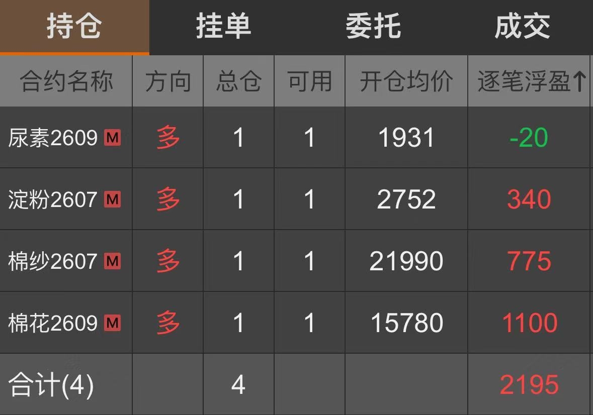 二、平仓计划 棉纱:达到启动点的平仓止损/止盈条件,在收盘前或下一个交易日开盘后全部平仓。 淀粉:达到启动点的平仓止损/止盈条件,在收盘前或下一个交易日开盘后全部平仓。 棉花:达到启动点的平仓止损/止盈条件,在收盘前或下一个交易日开盘后全部平仓。 尿素:达到启动点的平仓止损/止盈条件,在收盘前或下一个交易日开盘后全部平仓。 注:本交易总结由第三方提供,只作为投资理念和方法的交流,不作为七禾网的观点,也不作为投资参考和建议。 附: 1、交易者简介 十年股票/期货/外盘交易经验,每年都实现投资盈利。 擅长微观盘面分析和宏观市场分析,总结了数套有效的盈利模式,和众多高手有深入交流,收益良好。 2、持仓截图