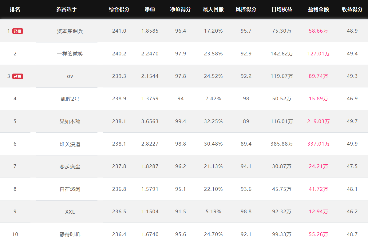 奖金上不封顶 特定期货公司参赛奖金翻倍 优秀选投 每周选优秀选手对接资金 达标必投 单笔最多给1个亿管理型资金 管理型资金盈利分成20%~70% 免费培训/研报/调研/咨询 诚邀您参赛! 为了促进国内期货市场交易人才的发展和成熟,七禾网举办本次“期货CTA英雄联盟”实盘大赛&超级服务,招募优秀的操盘手,为优秀的交易人才搭建桥梁! 第四届大赛圆满结束,第五届荣耀开启,欢迎参赛!第五届大赛已于2025年7月1日开赛,火热报名中,比赛过程中持续接受报名,大赛奖金&管理型资金&超级服务,等你来领! 2023年2月16日后,在主办方指定的几家期货公司中的某一家C公司新开户参赛,享奖金翻倍! 在主办方指定的几家期货公司中的某一家B公司新开户参赛,享奖金翻倍! 大赛中的优秀选手,只要在大赛中有3个月及以上的实盘业绩,主办方将每周发送优秀参赛者的业绩、资料给合作的数十家资方,供其考察是否投管理型资金。至2022年8月12日,资方已选出23名优秀投顾,累计投入超5.5亿元管理型资金。 优秀选投:通过主办方及资方考核后,将获得管理型资金(资金来源:七禾网自有资金(买优秀选手的基金产品)、七禾网股东、数十家合作资方) 在主办方指定的几家期货公司中的某一家B公司新开户参赛,以及2023年2月16日后,在主办方指定的几家期货公司中的某一家C公司新开户参赛,可以按照:“达标必投”进行考核(将给予单笔100万元~1亿元的管理型资金,分红比例20%~70%),详细规则请联系微信:15858201632 大赛综合排名前10名 2026.4.17