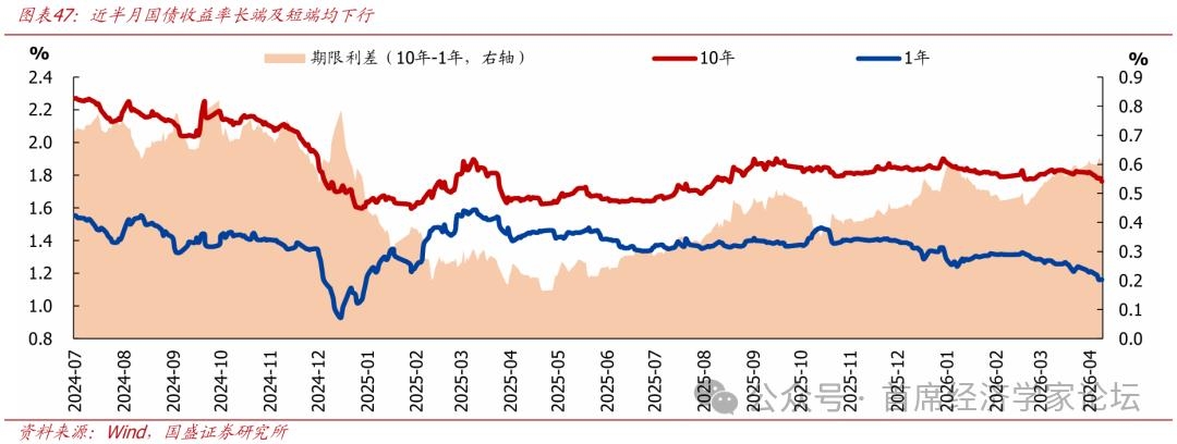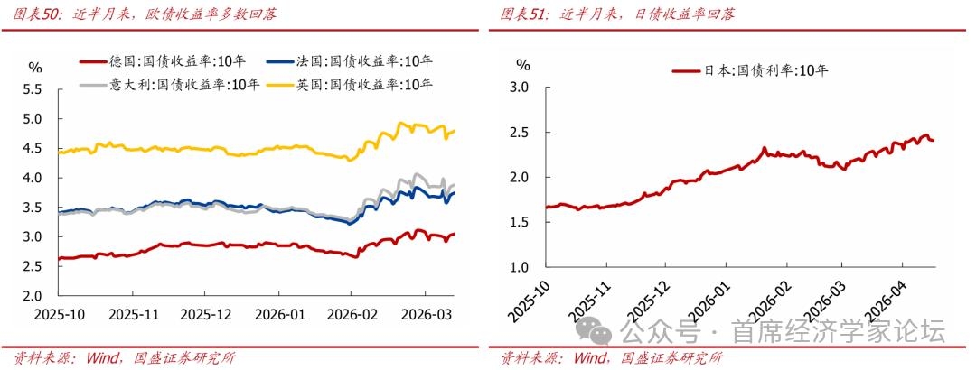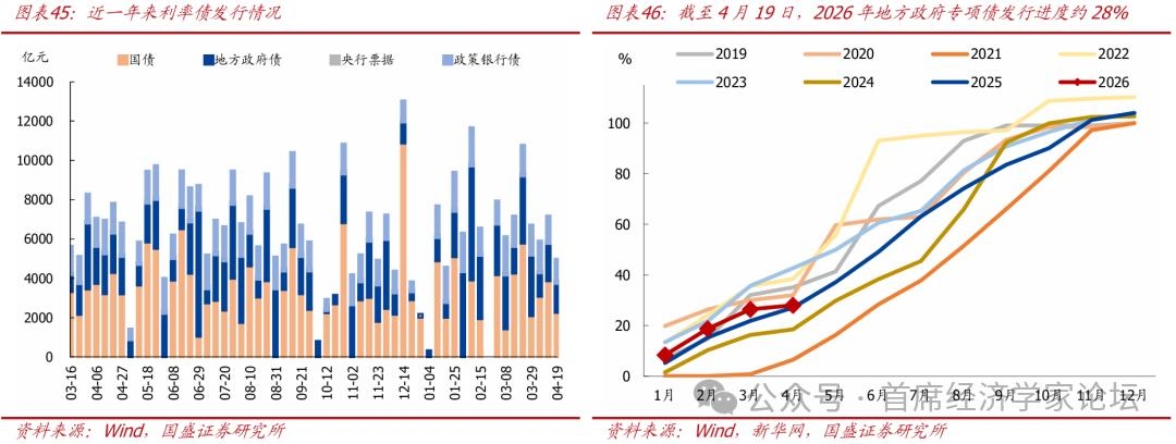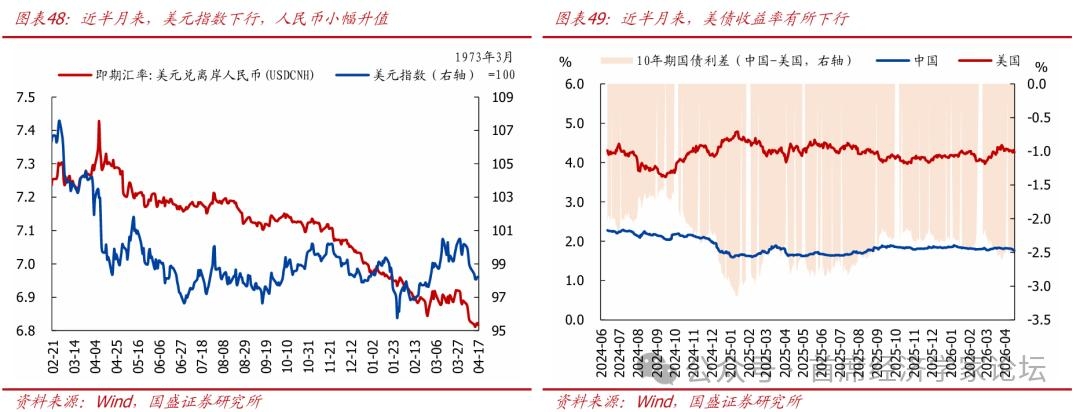 3.汇率&海外市场 受美伊谈判影响,市场避险情绪降温,近半月美元指数中枢环比下行1.1%,收于98.229;人民币小幅升值,美元兑离岸人民币汇率下降1.0%、收于6.817。由于谈判后通胀预期小幅降温,截至4月17日,10年期美债收益率较两周前下行9.0bp、收于4.26%,德、法、意、英、日国债收益率多数回落;中美利差(中国-美国)倒挂幅度收窄1.6bp、收于249.6bp。