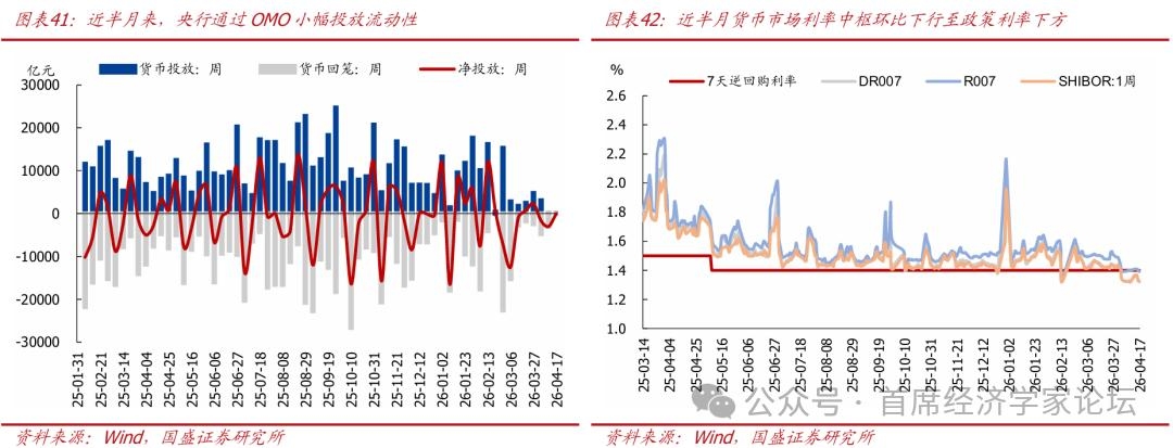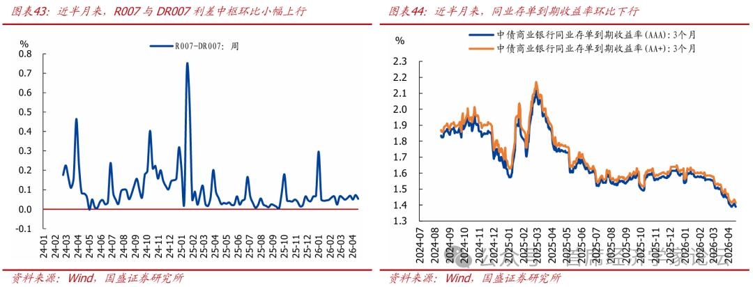 七、流动性跟踪:国内资金利率创新低,人民币汇率走强 1.货币市场流动性 流动性投放:由于近期银行间市场流动性延续宽松状态,近半月央行通过OMO加大流动性到期回笼。具体看,近半月央行通过OMO实现货币投放65亿元,到期回笼3075亿元,资金净回笼3010亿元。 货币市场利率:跨季后资金面超预期宽松,货币市场利率回落至政策利率下方。近半月来,DR007、R007和Shibor(1周)中枢环比分别下行8.9bp、8.6bp、8.7bp至1.320%、1.391%、1.326%,最新交易日已均低于7天逆回购利率。R007、DR007利差上行0.4个bp,但仍处于低位,不同机构间流动性分层现象不明显。同业存单到期收益率中枢环比下行,3月期AAA、AA+同业存单到期收益率环比均下行5.3bp。 整体看,继续提示:2026年货币宽松仍是大方向,但在常规货币政策空间收窄、防资金空转、银行息差等约束下,央行总量宽松会更加谨慎,基本面是核心考量,结构性宽松的优先级可能进一步提升。