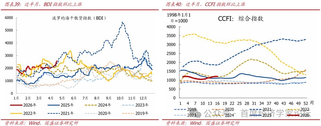 出口运价:BDI指数、CCFI指数均上涨。近半月来,波罗的海干散货指数(BDI)环比上升14.3%,相比2025年同期偏高76.5%。中国出口集装箱运价指数(CCFI)环比上升4.2%,相比2025年同期偏高9.1%。