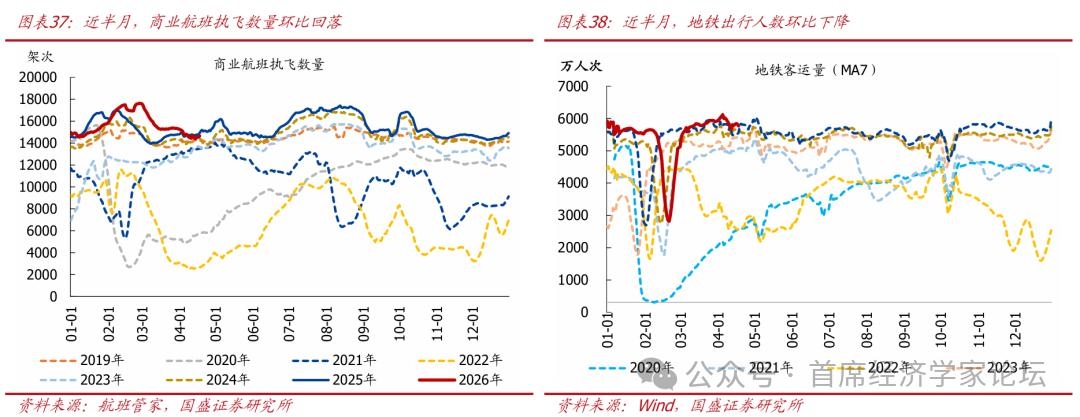 六、交通物流:航班执飞回落,航运价格上升 人员流动:航班执飞数量回落,地铁出行人数减少。近半月来,商业航班执飞数量均值环比下降4.4%,相比2025年同期偏低2.0%;10个重点城市地铁客运人数环比下降4.0%,绝对值为近年同期最高,相比2025年偏高1.6%。