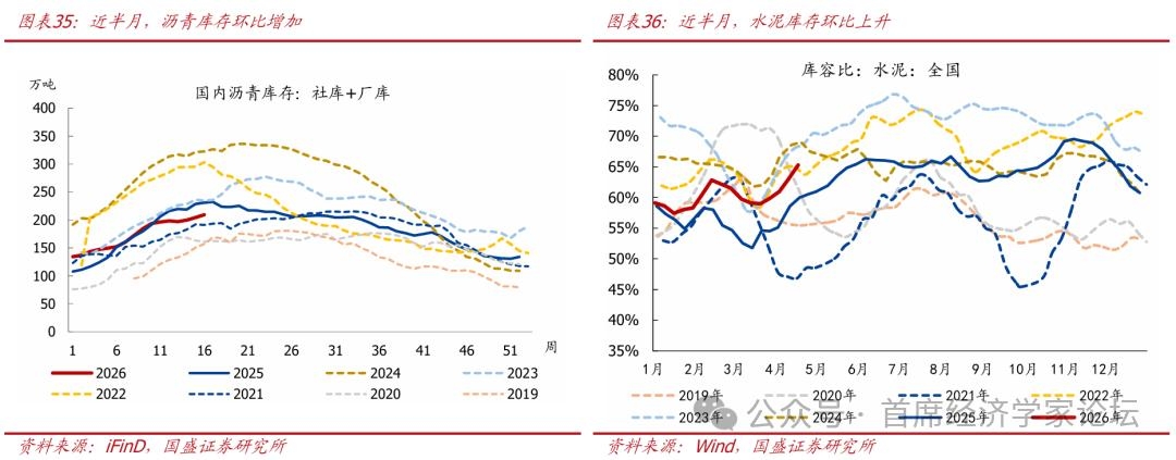 3.建材库存 沥青库存及水泥库容比均增加。近半月,沥青库存(厂库+社库)环比增4.9%,同比降9.4%。水泥库容比均值环比上升3.7个百分点至64.2%,相比2025年同期偏高5.6个百分点。
