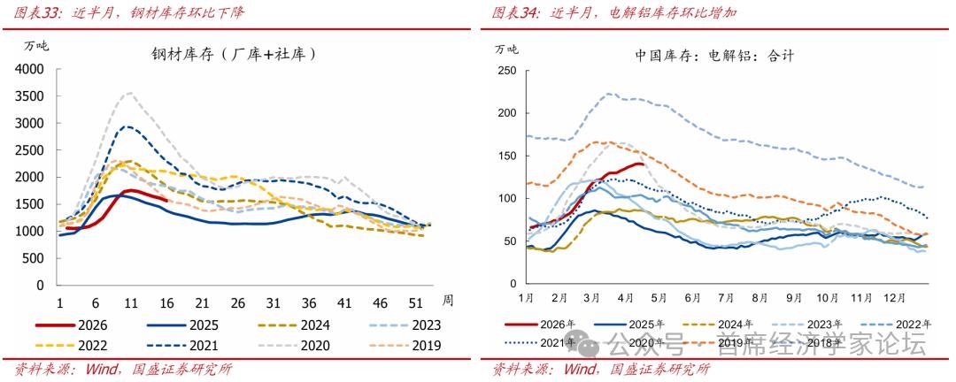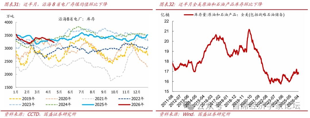 五、库存:能源库存下降,建材库存增加 1.能源库存 沿海8省电厂存煤及全美石油库存均下降。近半月来,沿海8省电厂存煤均值环比下降2.1%,同比下降1.7%、相比2019年同期偏高22.8%。截至2026年4月10日,全美原油及石油产品库存环比下降1353.8万桶,绝对值为16.8亿桶。