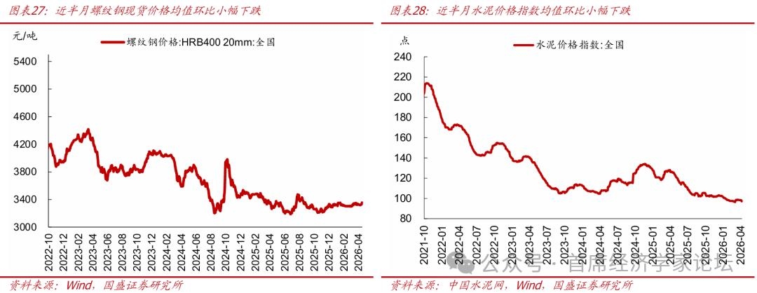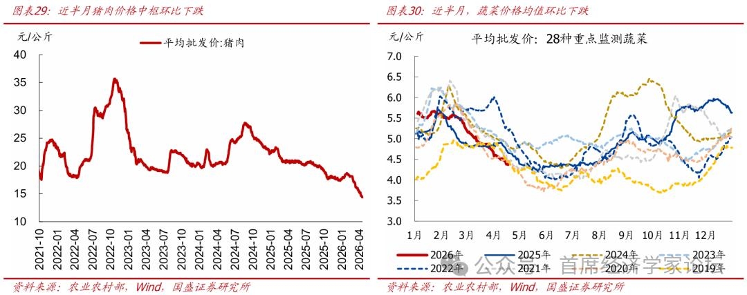 中游工业品:螺纹钢、水泥价格均小幅下跌。近半月来,螺纹钢现货价格均值环比下跌0.1%,同比上涨1.2%。水泥价格均值环比下跌0.6%、同比下跌22.7%。 下游消费品:猪肉、蔬菜价格均下跌。近半月来,猪肉价格均值环比下跌5.8%至约14.7元/公斤,同比下跌29.2%。蔬菜价格环比下跌5.8%,弱于季节规律(2019-2025年同期均值为跌3.7%),同比下跌7.4%。