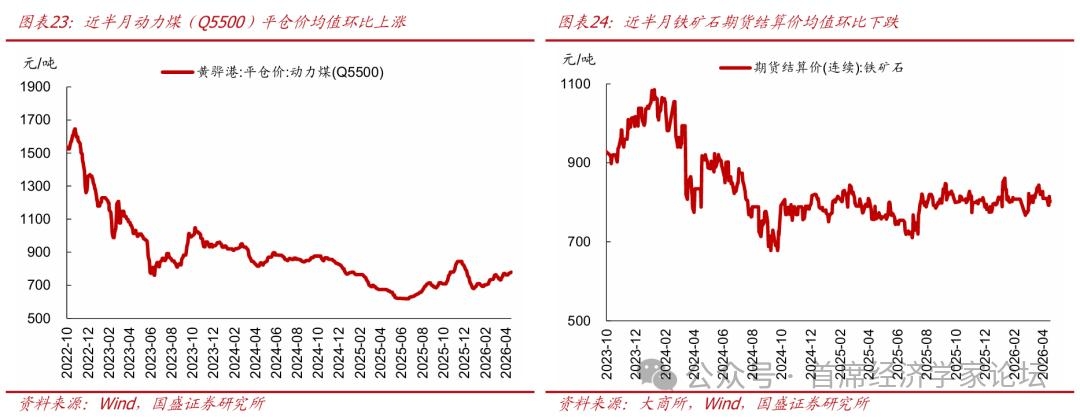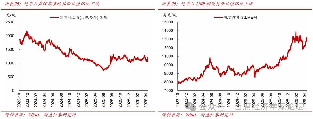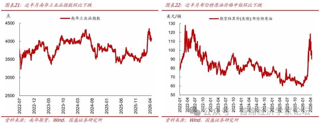 四、价格:油价延续高位,食品价格续跌 上游资源品:受美伊谈判影响,原油价格、煤炭价格有所回落,LME铜价上涨。近半月来,南华工业品指数均值环比下跌3.3%,同比涨幅为16%。重点大宗商品中:布伦特原油价格中枢环比下跌8.6%至98.4美元/桶。黄骅港Q5500动力煤平仓价均值环比上涨0.9%,同比涨幅扩大至14.4%。焦煤期货(连续合约)结算价近半月均值环比下跌7.9%,同比涨幅扩大至18.5%。铁矿石期货(连续合约)结算价近半月均值环比下跌2.5%,同比涨幅扩大至5.2%。LME铜现货价近半月均值环比上涨6%,同比涨幅扩大至43%。
