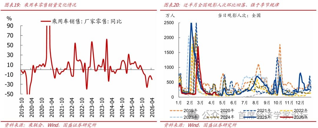 4月前两周乘用车销售偏弱。据乘联会,4月前两周,乘用车日均销售3.1万辆,环比降11.5%,同比降20%(3月同比降12.5%)。 近半月观影人次环比回落、强于季节规律。近半月,全国日均观影人次为101.6万人次,环比降5.5%,强于季节规律(2019-2025年同期环比均值为降16.4%),同比增5.0%。