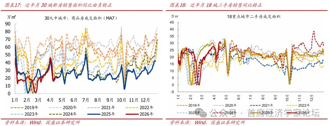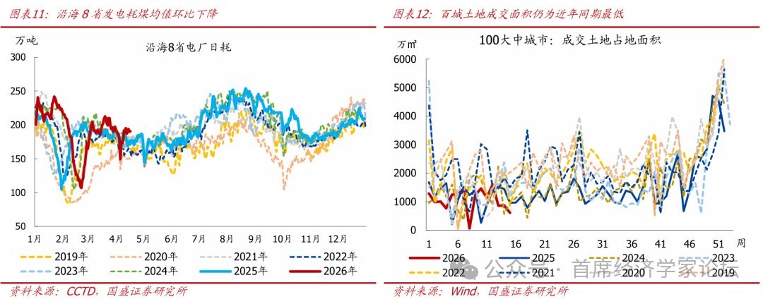 三、需求:地产销售持续改善,生产复工走势分化 1.生产复工:发电耗煤下降,钢材表需回升,土地成交偏弱 沿海8省发电耗煤环比下降,弱于季节规律。近半月沿海8省发电耗煤环比下降7.5%,弱于季节规律(2019-2025年同期均值为降4.1%),相比2019年同期偏高4%。 百城土地成交面积仍为近年同期最低。近半月,百城土地成交面积均值环比回落39.2%,弱于季节规律(2020-2025年同期均值为降4.1%),绝对值仍为近年同期最低,相比2025年同期偏低37.7%,相比2019年同期偏低62%。
