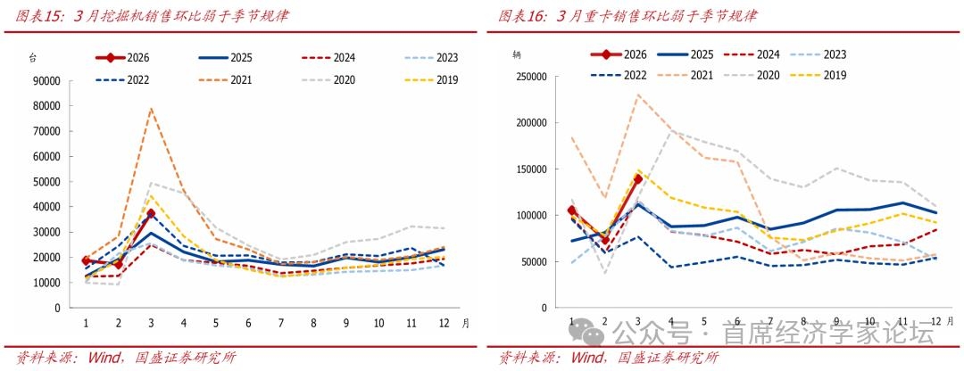 3月挖机销售环比弱于季节规律,重卡销售环比弱于季节规律,同比均为正增。3月挖掘机月均销量3.7万台,环比1-2月均值增加108.2%,弱于季节规律(2020-2025年同期均值为增162.6%),同比增26.4%。3月重卡月均销量13.9万辆,环比1-2月均值增加55.3%,弱于季节规律(2020-2025年同期均值为升87.2%),同比增24.6%。