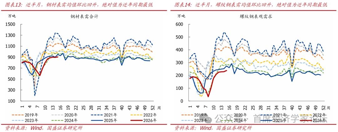 钢材表需环比回升、弱于季节规律,绝对值仍为近年同期最低。近半月,钢材表需均值环比升0.7%至899.8万吨,弱于季节规律(2019-2025年同期环比均值为2.9%),绝对值仍为近年同期最低,相比2025年、2019年同期分别偏低2.7%、21.4%。其中:螺纹钢表需均值环比回升16%,略弱于季节规律(2019-2025年同期环比均值为19.3%),绝对值也为近年同期最低,相比2025年、2019年同期分别偏低11.2%、44.3%。