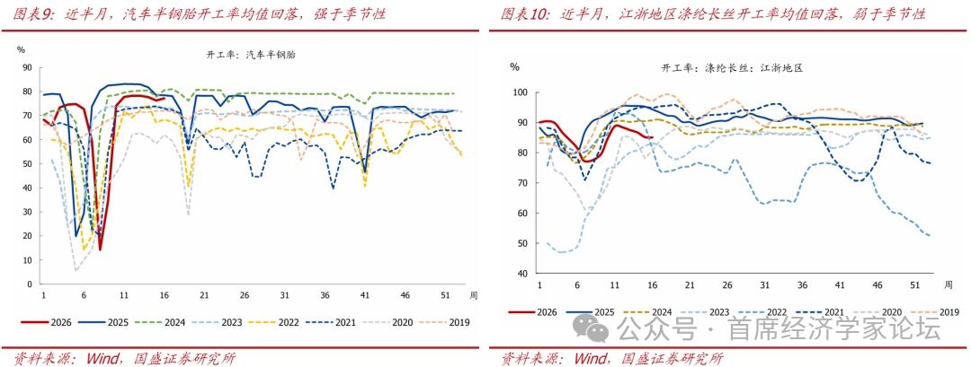 中下游看,汽车半钢胎、涤纶长丝开工率均回落。近半月来,汽车半钢胎开工率均值环比下降1.2个百分点至76.7%,强于季节规律(2019-2025年同期均值为下降1.9个百分点),相比2025年同期偏低1.8个百分点、相比2019年同期偏高10.4个百分点。江浙地区涤纶长丝开工均值环比下降2.0个百分点至85.1%,弱于季节规律(2019-2025年同期均值为下降1.5个百分点),相比2025年、2019年同期分别偏低9.7、12.3个百分点。