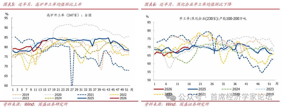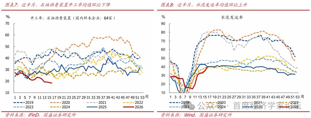 二、供给:上游开工走势分化,下游开工回落 上游看,高炉开工率和水泥发运率回升,焦化、沥青开工率回落。近半月来,全国247家样本高炉开工率均值环比上升1.2个百分点至83.2%,弱于季节规律(2019-2025年同期均值为上升1.8个百分点),相比2025年同期偏低0.2个百分点、相比2019年同期偏高1.3个百分点。焦化企业开工率均值环比下降0.2个百分点至69.5%,弱于季节规律(2019-2025年同期均值为上升0.3个百分点),相比2025年、2019年同期分别偏高1.0个百分点、5.9个百分点。石油沥青装置开工率均值环比下降0.8个百分点至18.6%,为近年同期最低,弱于季节规律(2019-2025年同期均值为上升1.9个百分点),相比2025年、2019年同期分别偏低9.6、26.8个百分点。水泥发运率均值环比上升4.6个百分点至37.4%,强于季节规律(2019-2025年同期均值为上升4.2个百分点),相比2025年、2019年同期分别偏低4.2、36.4个百分点。