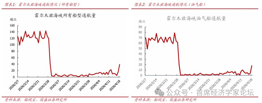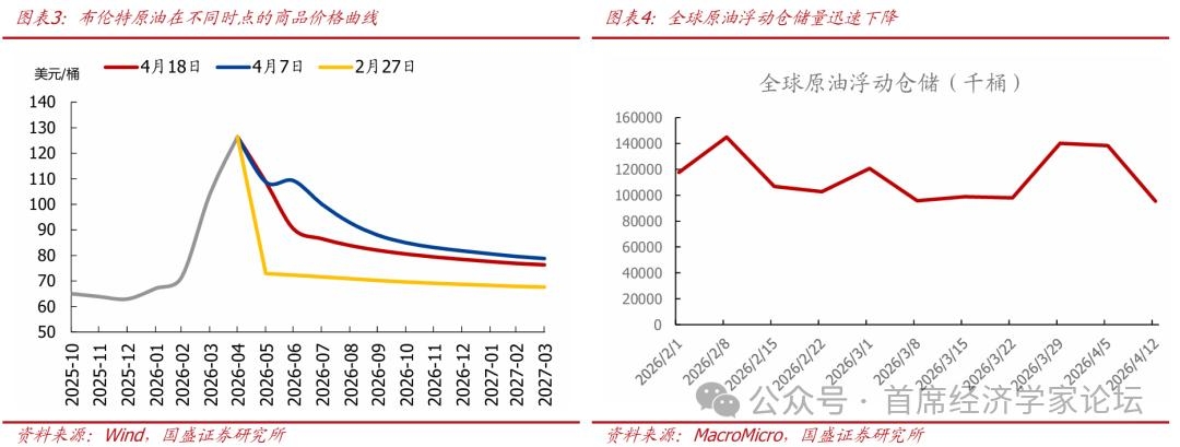 | 一、热点追踪:美伊冲突最新进展 霍尔木兹海峡短暂开放,通航量有所回升,但现已再次关闭。美以伊冲突前,2月霍尔木兹海峡所有船型日均通航量为123艘次,3月骤降为日均6艘次;4月8日,美伊达成为期两周的临时停火协议,4月8日至4月17日海峡日均通航量上升至13艘次;4月17日下午,伊朗宣布霍尔木兹海峡对所有商船暂时开放,18日海峡通航量达到37艘次,其中油气船通航量为16艘次;4月18日,伊朗再次宣布海峡关闭,海峡总计开放不足24小时。 受停火协议及谈判影响,市场预期布油价格将在三季度回落至80美元/桶附近。冲突爆发前,市场预期全年原油价格中枢约为70美元/桶;冲突爆发后,市场预期全年原油价格中枢将升至90美元/桶;临时停火协议达成后,全年原油价格预期回落至86美元/桶。 全球原油浮动仓储量迅速下降。霍尔木兹海峡通行受阻,波斯湾原油外运近乎停滞,市场转向海上浮仓抢购可即刻获取的原油。截至4月12日,全球原油浮动储量为9550.5万桶,较3月以来高点下降31.8%。