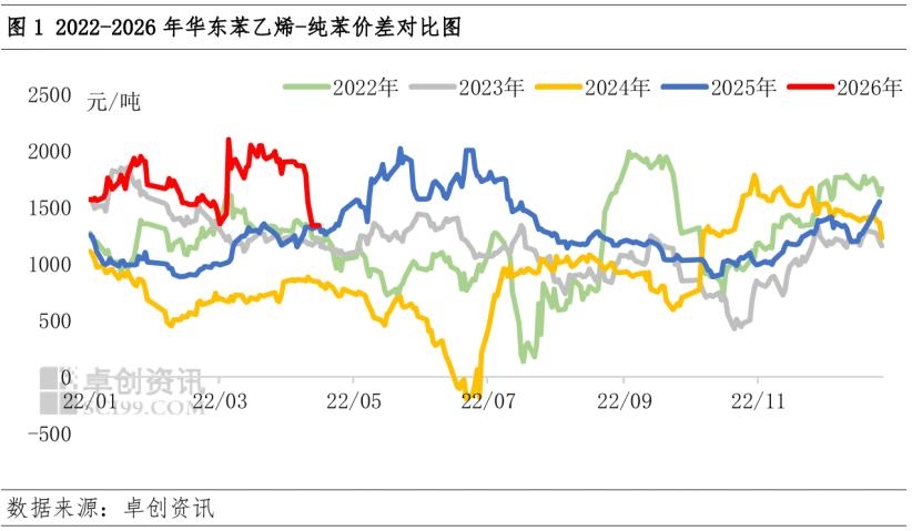 | 导语:进入2026年以来,苯乙烯-纯苯价差大致呈现“M”型走势,至4月中旬,二者价差降至年内最低水平,主要纯苯基本面格局要强于苯乙烯。后市来看,苯乙烯与纯苯基本面预期均偏强,但乙烯价格尚维持高位,苯乙烯利润处于亏损且港口预计下降至10万吨以内,综合来看,苯乙烯-纯苯价差或在目前水平下走扩的性价比或大于继续收窄。 纯苯格局逐步转强,压缩苯乙烯-纯苯价差 3月初,地缘问题爆发,苯乙烯-纯苯价差快速走扩,一度涨至近五年来最高水平2100元/吨,后维持高位震荡。原油宽幅上涨以来,苯乙烯在出口超预期增加预期下,涨势偏强,而纯苯主港库存巨高不下,表现弱于苯乙烯,苯乙烯-纯苯价差快速走扩。进入4月份,纯苯去库力度开始加快,且检修预期增多、进口预期下降,基本面格局转强;而苯乙烯利好依然是出口超预期增加, 但库存尚未兑现出口增多去库的预期,库存下降力度不及预期,基本面格局较纯苯偏弱,二者价差快速收窄,甚至低于地缘问题爆发前的水平。截至4月17日,华东苯乙烯-纯苯价差收窄至1340元/吨。