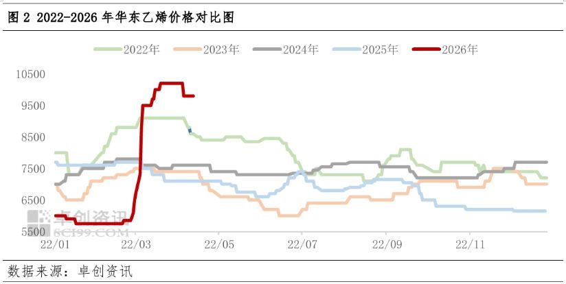 乙烯价格高位,或限制苯乙烯-纯苯价差进一步收窄空间 近三年来,中国乙烯价格基本处于7500元/吨下方,2026年一季度更是跌至6000元/吨下方,较低的乙烯价格一定程度给苯乙烯利润提供空间。但3月地缘问题以来,乙烯价格受供应紧张影响,价格宽幅上涨,最高冲至万元以上,成为近五年来的最高水平,后价格虽有回落,但依然处于9000元/吨上方。因此若苯乙烯-纯苯价差收窄至1200元/吨以内的水平时,乙烯价格仍处于高位,苯乙烯成本压力增加,或限制苯乙烯-纯苯价差进一步收窄空间。