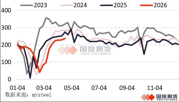 | 一波调整过后,钢价下行压力得到快速释放,震荡区间下沿支撑依然较强,近期整体呈现企稳反弹态势,热卷表现相对较强。盘面价格走强,一方面受益于宏观情绪回暖,从一季度数据看,国内经济开局良好,GDP增长5%好于预期。随着地产销售面积降幅收窄,基建、制造业投资增速回升,市场对钢材需求预期有所好转。另一方面,当前钢厂利润微薄,成本定价仍是市场运行主线,随着炉料价格企稳走强,成本中枢上移对钢价形成明显支撑。拉长时间周期看,市场整体仍延续低位区间震荡筑底走势,下方空间不是太大,反弹持续性也相对不足。后期能否打开上方空间,关注供需层面高频数据变化,以及内需刺激、“反内卷”等相关政策落地推进情况。 从需求方面看,随着气温回暖,建材需求进入“金三银四”传统旺季,螺纹表需环比回升,同比仍相对偏弱。库存从高点逐步下降,节奏相对缓慢,去库持续性面临一定考验。而在出口表现亮眼,制造业韧性较强的背景下,热卷需求相对较好,库存去化较为顺畅,高库存压力逐步缓解。从供应端看,随着需求环比回暖,高炉也呈现季节性复产态势,铁水产量回到相对高位。由于下游承接能力不足,钢厂利润依然微薄,近期高炉复产态势明显放缓,部分区域已经开始减产检修,供应压力边际缓解对钢价形成支撑。在供需格局相对宽松的背景下,近年来钢厂利润微薄,钢价基本跟随成本波动。随着铁矿石、焦煤等炉料价格企稳反弹,叠加原油价格维持高位推升通胀预期,成本对钢价支撑依然较强。 图1:螺纹钢周度表观消费量(万吨)
