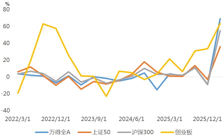 图为美国通胀水平有所抬升 对国内市场而言,得益于多元化的能源储备体系,国内经济具备较强的抗风险韧性,中东地缘冲突对我国经济的影响整体可控。同时,地缘危机也为我国人民币国际化进程以及能源结构转型提供了宝贵的时间窗口期。 一季度国内经济实现“开门红” 2026年一季度,国内经济实现良好开局,经济运行呈现稳中有进的发展态势。相关数据显示,一季度国内GDP同比增长5.0%,较2025年四季度加快0.5个百分点,同时名义GDP增速从2025年四季度的3.9%跃升至4.9%。名义GDP增速大幅走高主要得益于价格指标的温和修复。3月PPI同比上涨0.5%,结束了自2022年11月以来连续41个月的负增长,这一数据的改善具有标志性意义。PPI数据的转正,固然受到国际油价上涨的推动,带动能源相关行业价格回升,但更多是受到国内企业利润持续改善、工业生产活跃度提升的驱动,反映出国内制造业景气度的持续复苏。 一季度国内经济的良好表现,主要得益于出口改善、制造业升级和新质生产力相关领域的拉动,形成了多轮驱动的增长格局。从“三驾马车”来看,出口表现最为亮眼,成为拉动经济增长的核心动力,其中我国对欧盟、日本及东盟等主要贸易伙伴的出口增速大幅上升。消费方面,受今年春节偏晚以及去年同期基数偏高的影响,3月社会消费品零售总额增速虽然较1至2月有所放缓,但整体仍保持平稳运行态势。提振内需是今年经济工作的重中之重,预计未来一段时间,国内将进一步出台促消费政策,二、三季度需求增速有望稳步攀升。投资方面,受益于基建投资及制造业投资的快速增长,一季度国内固定资产投资保持平稳上行态势,为经济增长提供了坚实支撑。政策靠前发力是推动基建投资快速增长的主要原因。年初地方政府专项债发行速度显著快于去年同期,同时高新技术行业的快速发展带动相关基础设施建设投资增长,叠加制造业升级需求,促使制造业投资增速加快。地产投资虽然仍在低位运行,但已经出现积极变化,一季度新房及二手房成交量大幅增长,一线城市房价环比止跌企稳,市场信心逐步恢复。预计今年下半年房地产市场将逐步企稳。 “盈利修复”进行时 随着2025年年报及2026年一季报的陆续披露,A股整体盈利情况较前一年度明显改善,盈利增速稳步回升。其中,创业板上市公司净利润同比增速自2025年下半年以来持续回升,值得注意的是,尽管创业板指数连创新高,但估值水平依旧处于历史中等偏下区间,仍然具备一定的估值修复空间。从行业板块来看,电力、计算机、有色金属、国防军工等行业净利润同比增速位居前列,成为带动市场盈利修复的核心力量。